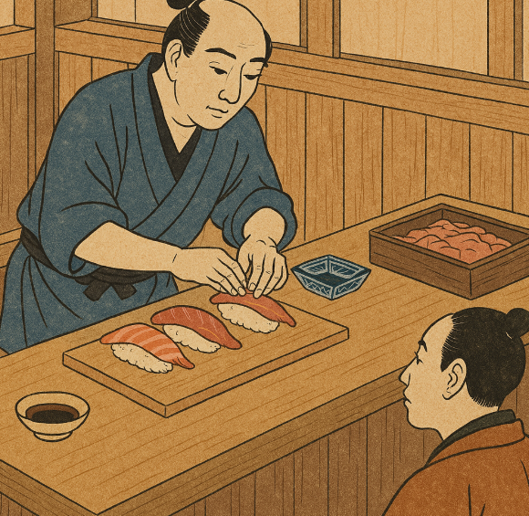 현재 우리가 흔히 알고 있는 스시는 ‘에도마에 스시(江戸前寿司)’라고 불리는 형태로, 19세기 에도(지금의 도쿄)에서 탄생했습니다. 에도는 당시 일본의 정치, 경제, 문화의 중심지로 급격한 성장을 이루고 있었고, 그에 따라 사람들은 빠르고 간편하게 즐길 수 있는 음식을 찾기 시작했습니다. 이러한 사회적 요구 속에서 에도마에 스시는 혁신적인 형태로 등장하게 됩니다.
