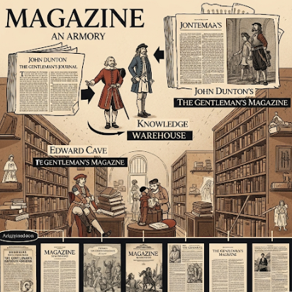 1692년, 영국의 문학 비평가이자 저널리스트인 존 던턴(John Dunton)이 **"The Gentleman's Journal: or the Monthly Miscellany"**라는 출판물을 발행합니다. 이 출판물은 시, 에세이, 뉴스, 정보 등 다양한 종류의 글들을 한데 모아놓은 형태였습니다. 던턴은 이 책자를 **'지식의 창고'**라는 의미에서 'magazine'이라고 부르기 시작합니다. 마치 화약고에 다양한 화약과 무기가 모여 있듯이, 이 출판물에는 다양한 지식과 정보가 모여 있다는 비유적인 표현이었죠.