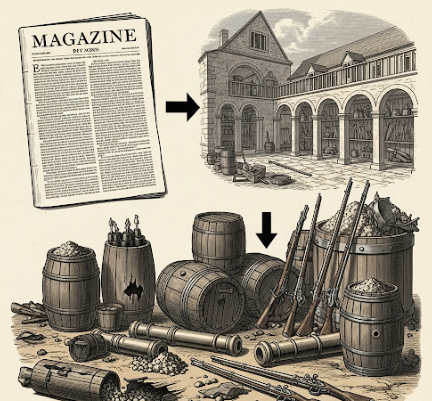 시간이 흐르면서 'makhzan'에서 파생된 유럽어 단어들은 단순히 물건을 보관하는 장소뿐만 아니라, **군사적인 의미의 '저장고'**로도 사용되기 시작합니다. 특히 무기나 탄약, 화약 등을 보관하는 시설을 'magazine'이라고 부르게 되죠. 우리가 영화에서 흔히 보는 '총기 탄창'을 'magazine'이라고 부르는 것도 바로 이 연장선상에 있습니다. 탄약이 모여 있는 곳이기 때문이죠.