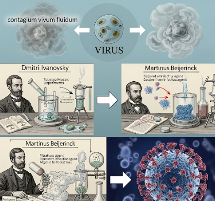 그러나 여전히 필터에 걸러지지 않는, 박테리아보다 훨씬 작은 감염원들이 존재한다는 사실이 드러났죠. 1892년 러시아의 드미트리 이바노프스키는 담배 모자이크병을 일으키는 원인이 박테리아 필터를 통과한다는 것을 발견했고, 1898년 네덜란드의 마르티누스 베이예링크는 이를 'contagium vivum fluidum', 즉 '살아있는 전염성 액체'라고 명명하며 오늘날 **'바이러스(virus)'**라는 용어를 처음으로 사용했습니다.